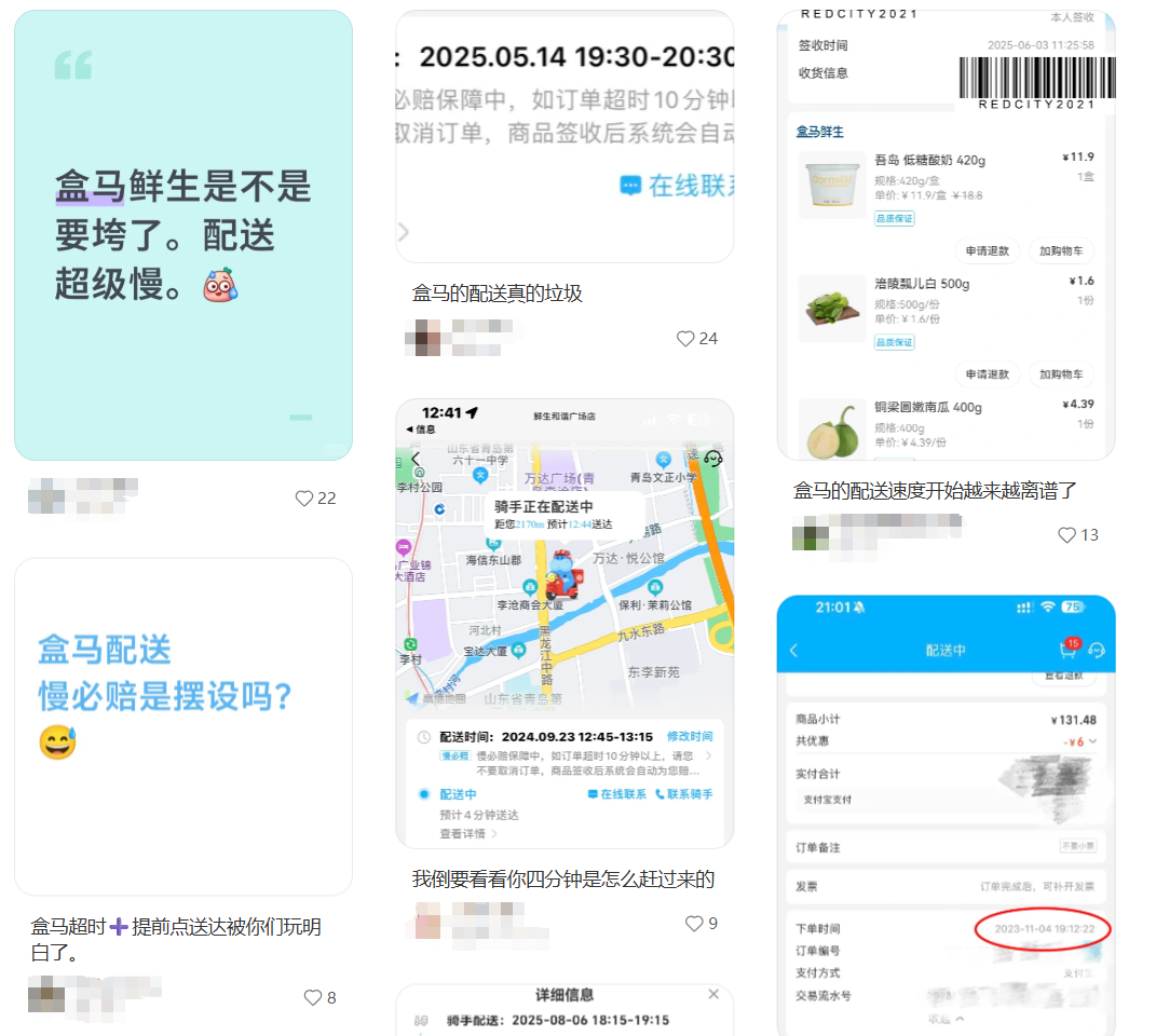 服務(wù)能力方面,線上履約是盒馬的核心競爭力之一。隨著規(guī)模增長和與阿里的業(yè)務(wù)聯(lián)動日漸頻繁,盒馬有必要重視運力瓶頸和配送算法能力。在8月初淘寶88VIP可領(lǐng)盒馬會員后,盒馬會員數(shù)量翻倍的同時,帶來訂單激增,隨之而來的就是履約能力明顯跟不上節(jié)奏。小紅書上,不少用戶吐槽配送變慢,「兩小時訂單還沒送到」的抱怨聲屢見不鮮。