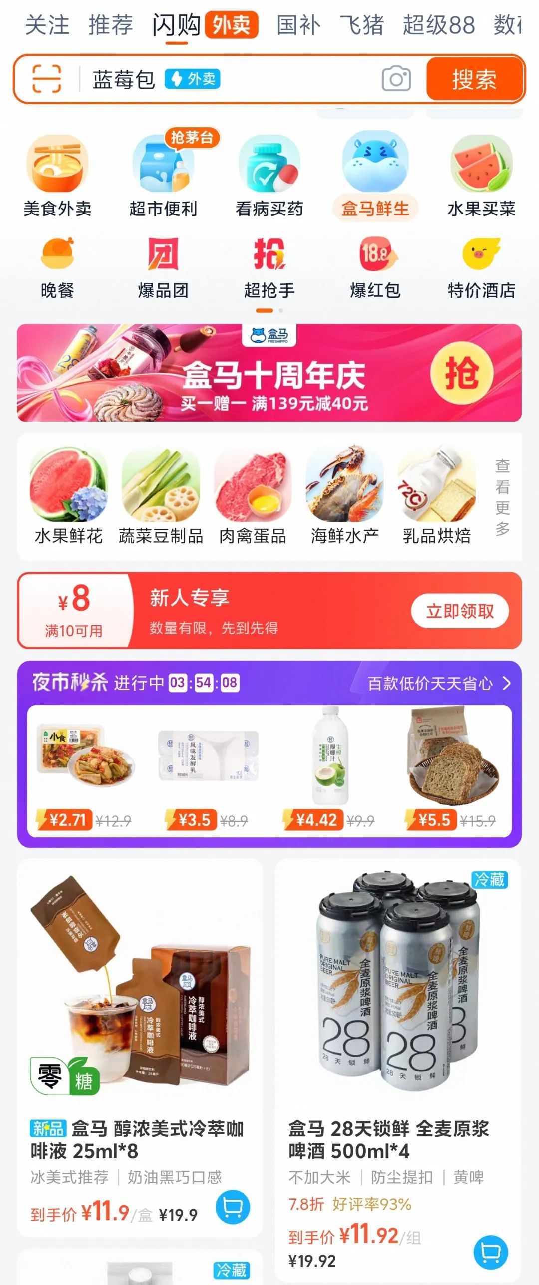 ▲淘寶首頁「閃購」入口上線「盒馬生鮮專區(qū)」