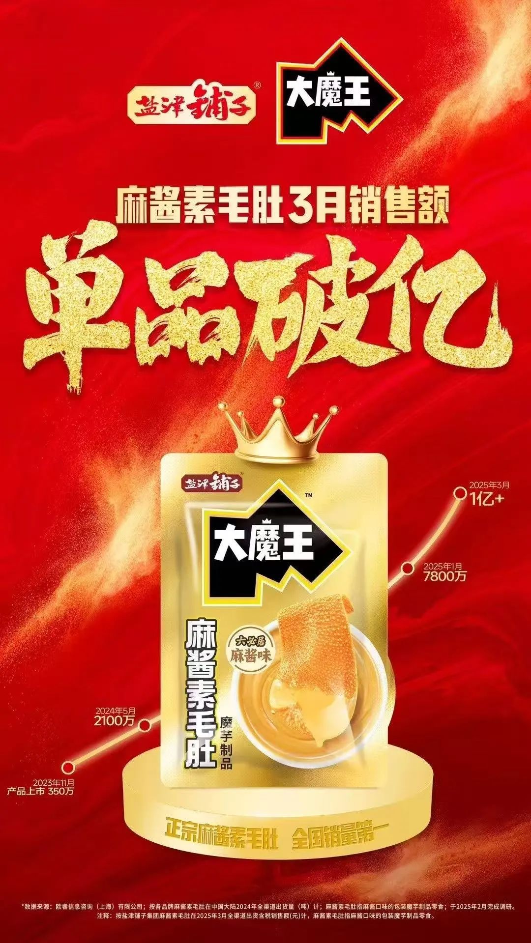 資料顯示,2023年10月,鹽津鋪子推出新中式魔芋零食品牌“大魔王”,并與中華老字號六必居聯(lián)合推出“六必居麻醬味”魔芋素毛肚。該產(chǎn)品于2023年11月正式面世,首月銷售額僅350萬元。