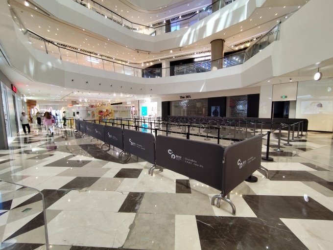 本月16號(hào),在圈內(nèi)有個(gè)新聞,CP靜安引入了TWOI 上海奶油百貨,結(jié)果開業(yè)儀式被擠癱。筆者在兩天后前往該商場(chǎng),商場(chǎng)的中庭排放著整齊的“鐵馬”(見下圖),是為該店鋪的客流準(zhǔn)備的,盡管已經(jīng)改成線上預(yù)約了。如今的商場(chǎng),某個(gè)店鋪的入內(nèi)還要預(yù)約,還真有你的!