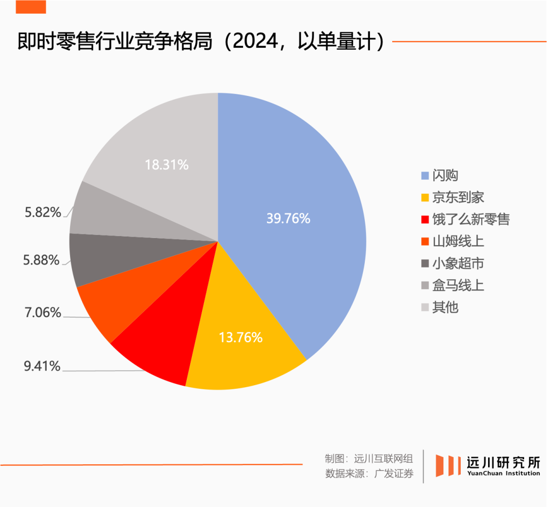 所謂即時(shí)零售,可以簡(jiǎn)單理解為用送外賣的方式送其他商品,最顯著的特征是把電商半日達(dá)的效率一下提高到了半小時(shí)。截至2024年,美團(tuán)獨(dú)拿即時(shí)零售近四成市場(chǎng)份額[3]。