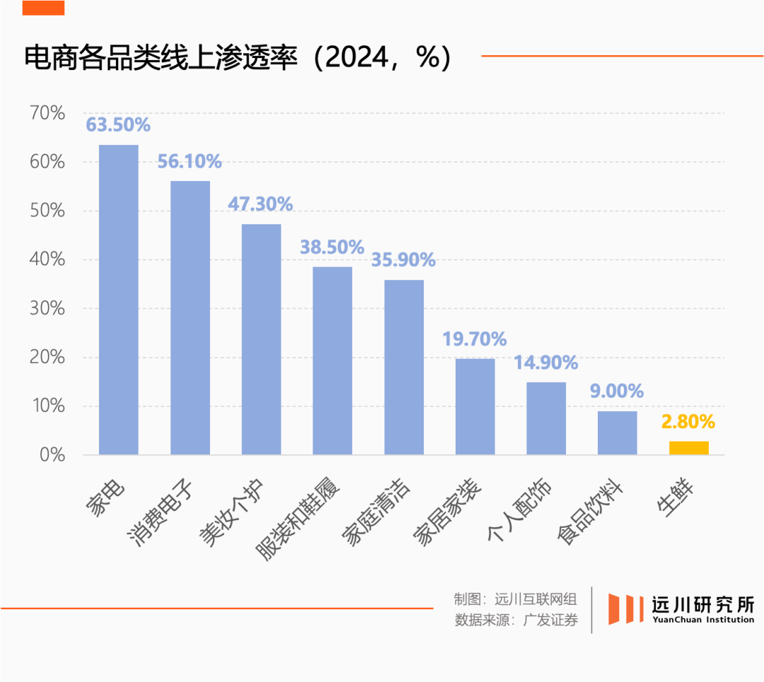 和外賣一樣,電商的理論天花板是14億人所有東西都在線上買,但這不太現(xiàn)實(shí)。不同品類的線上化率一定存在上限,上限高的如數(shù)碼3C和化妝品,上限低的如生鮮,酣戰(zhàn)多年線上化率依然只有2.8%。