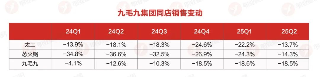 這背后,正是同店銷售的持續(xù)承壓。2025 年上半年,太二同店銷售下滑 19.0%,慫火鍋跌 20.1%,九毛九餐廳亦降 19.8%。