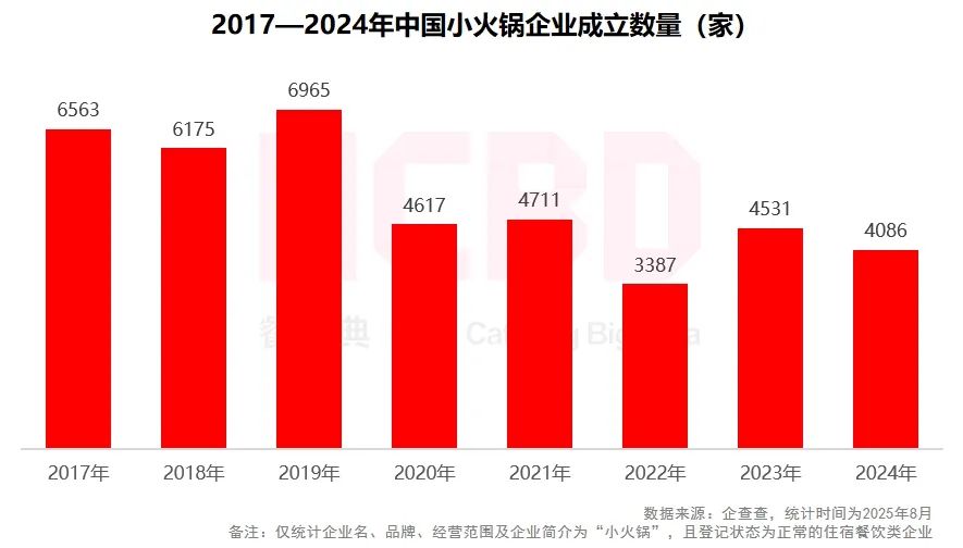 (1)2019年全國小火鍋企業(yè)成立數量近7000家,此后開始下降;2024年成立的小火鍋企業(yè)數量超過4000家,與2019年相比有大幅縮水