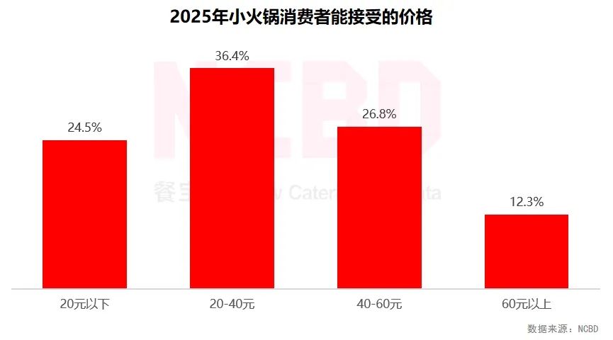 (4)小火鍋消費者對價格敏感度較高。能接受價格在20—40元之間的群體占比最高,比例為36.4%;1/4的消費者最能接受20元以下的客單價;12.3%的消費者最能接受60元以上的單價