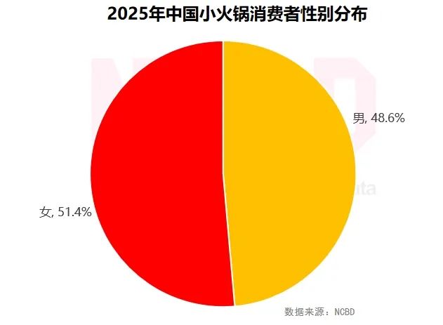 (1)從性別來看,小火鍋消費者中女性比例略高于男性,為51.4%,男性占48.6%