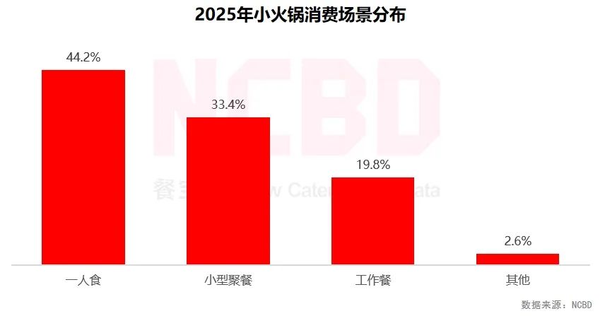 (3)從小火鍋的消費場景來看,一人食占比44.2%,比例最高,主要針對單身消費者或獨自用餐的情況;工作餐占比接近20%,主要針對上班族群體