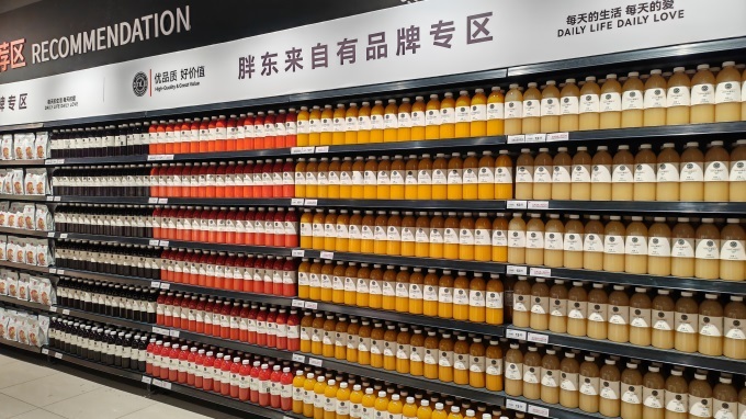 胖東來自有品牌專區(qū)首次進(jìn)入裕華區(qū),DL草莓水果燕麥脆、DL100%葡萄復(fù)合果汁、DL壓榨一級(jí)花生油、DL精釀啤酒、DL寶豐自由愛白酒等70余款商品集中陳列。永輝優(yōu)選系列如100%桃汁、黑松露火腿蘇打餅干、智利無核西梅干、厚切蘋果干等商品一同亮相,共同構(gòu)建出層次豐富的商品矩陣。