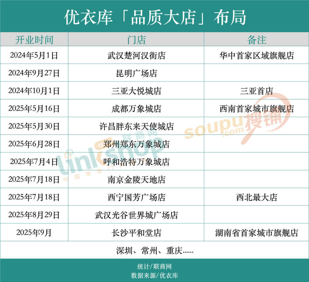 2025年,優(yōu)衣庫正加速與區(qū)域城市生活的深度融合。5月,優(yōu)衣庫開設了西南首家城市旗艦店·成都萬象城店,6-8月在鄭州、呼和浩特、西寧、南京相繼開店,8月29日武漢光谷世界城廣場店即將開業(yè),近2個月有5家優(yōu)質(zhì)門店落地。