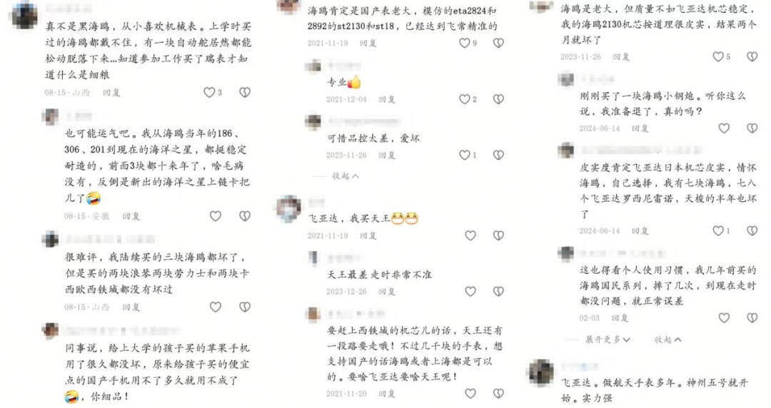 例如,盡管海鷗表的自研機(jī)芯實(shí)力有目共睹,但品牌手表的生產(chǎn)工藝及質(zhì)量卻不時(shí)受到消費(fèi)者吐槽——“自動(dòng)舵居然都能松動(dòng)脫落下來”“品控太差,愛壞”,舊表“啥毛病沒有,反倒是新出的海洋之星上鏈卡把兒了”等品控質(zhì)疑時(shí)有發(fā)出。其他,如天王表等“走時(shí)不準(zhǔn)”的評(píng)論也時(shí)常見諸各個(gè)腕表內(nèi)容評(píng)論區(qū)。