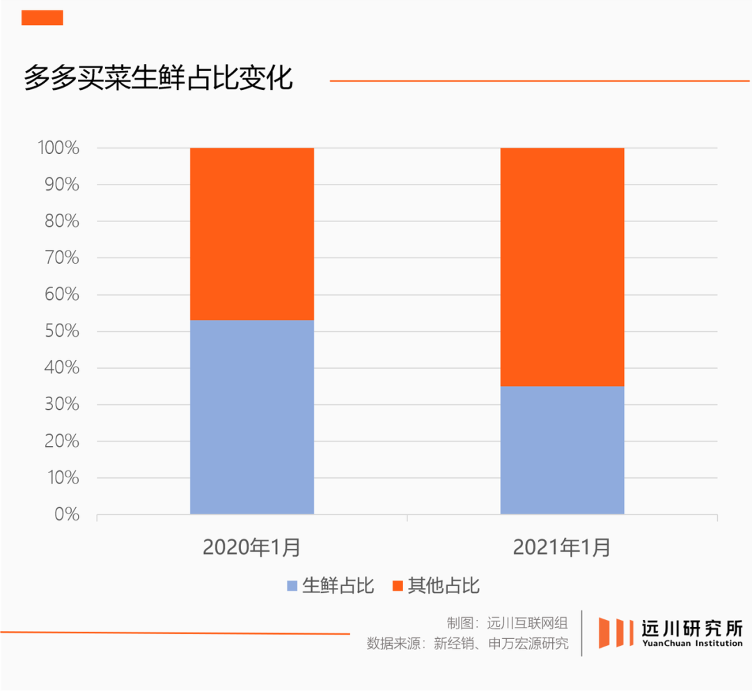 2020年底的主流社區(qū)團(tuán)購平臺上,生鮮占SKU比重下降到40%,占GMV比重下降到30%,接近傳統(tǒng)商超[10]。