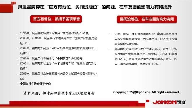 鳳凰作為上海老字號品牌被官方授予了“中國馳名商標(biāo)”、“中國老字號名牌”和“中華老字號”等一系列榮譽,并且是中國自行車協(xié)會理事單位。然而,鳳凰在民間尤其是車友圈并未形成良好的口碑效應(yīng),在騎行車友圈的品牌占有率遠(yuǎn)低于捷安特、美利達(dá)等臺灣品牌以及閃電、崔克等國外高端自行車品牌?梢哉f是陷入了“官方有地位,民間沒地位”的尷尬處境。