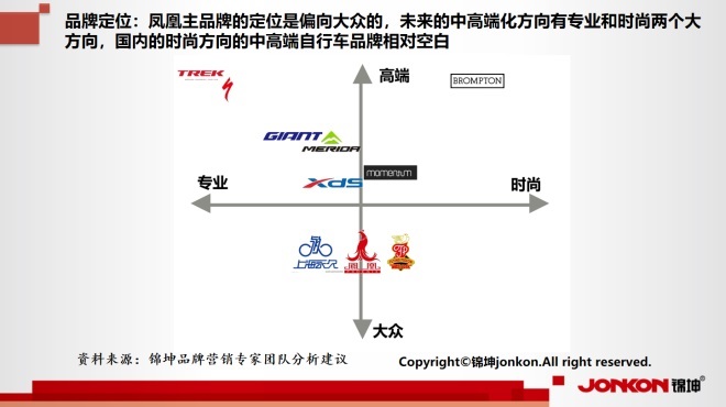 從上圖可以看到,自行車行業(yè)的老字號品牌鳳凰、永久和飛鴿都是偏向中低端的大眾品牌,且沒有形成鮮明的風(fēng)格指向。而中高端品牌可以分為專業(yè)運動派和時尚休閑派兩大類,相比指之下,專業(yè)化的賽道更加擁擠,而時尚方向的中高端自行車品牌尤其是該類別的國貨品牌相對空白,這也是鳳凰進(jìn)行高端化的重要方向。