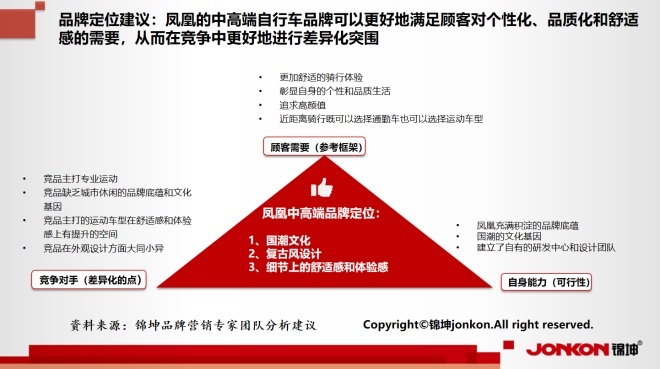 在明確了以時尚化作為高端化的具體風(fēng)格路徑之后,鳳凰的中高端品牌更加具體化定位可以從三個角度進(jìn)行分析,分別是顧客需要、自身能力和競爭對手。