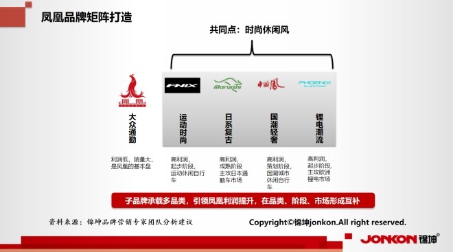 進(jìn)一步來說,F(xiàn)NIX可以主打運動休閑風(fēng),強調(diào)簡約清新的設(shè)計和更加舒適的騎行體驗;中國鳳可以主打城市休閑風(fēng),強調(diào)復(fù)古風(fēng)、國潮的設(shè)計和城市輕奢小清新的小資情調(diào)。