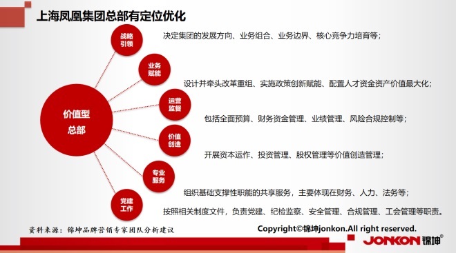 國企集團(tuán)總部有典型的機關(guān)型總部、經(jīng)營型總部、價值型總部等類型,結(jié)合鳳凰的實際情況并為了改善上述問題,幫助并且更好地實現(xiàn)戰(zhàn)略目標(biāo),鳳凰集團(tuán)應(yīng)當(dāng)打造價值型總部:即總部以業(yè)務(wù)發(fā)展為中心,充分激發(fā)經(jīng)營活力動力;以創(chuàng)造價值為根本,充分激發(fā)經(jīng)營活力;以創(chuàng)造價值為根本,提升專業(yè)能力服務(wù)水平,把控和實現(xiàn)集團(tuán)戰(zhàn)略。