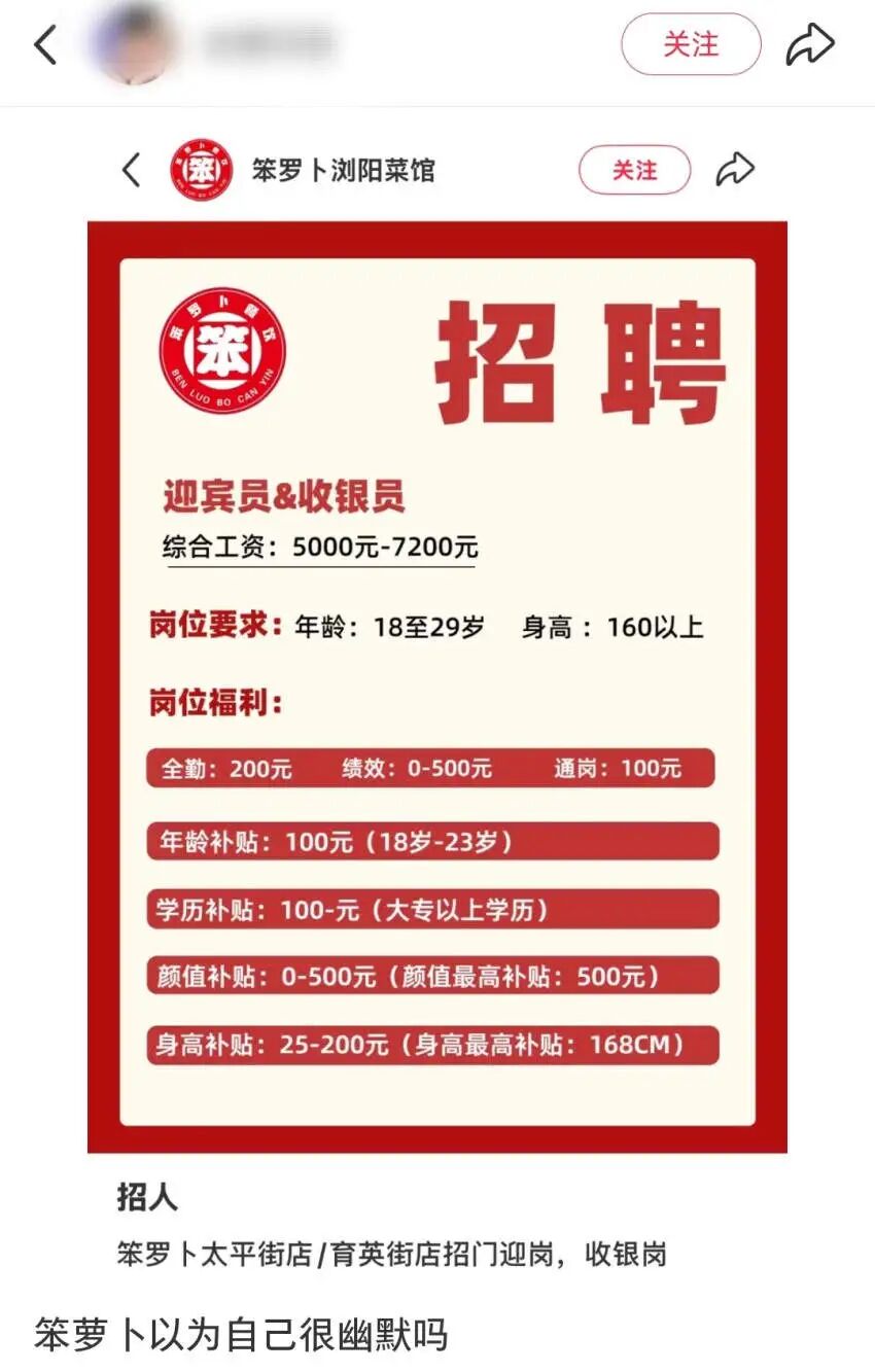 按臉定薪?長(zhǎng)沙笨羅卜瀏陽(yáng)菜館招聘設(shè)置“顏值補(bǔ)貼”