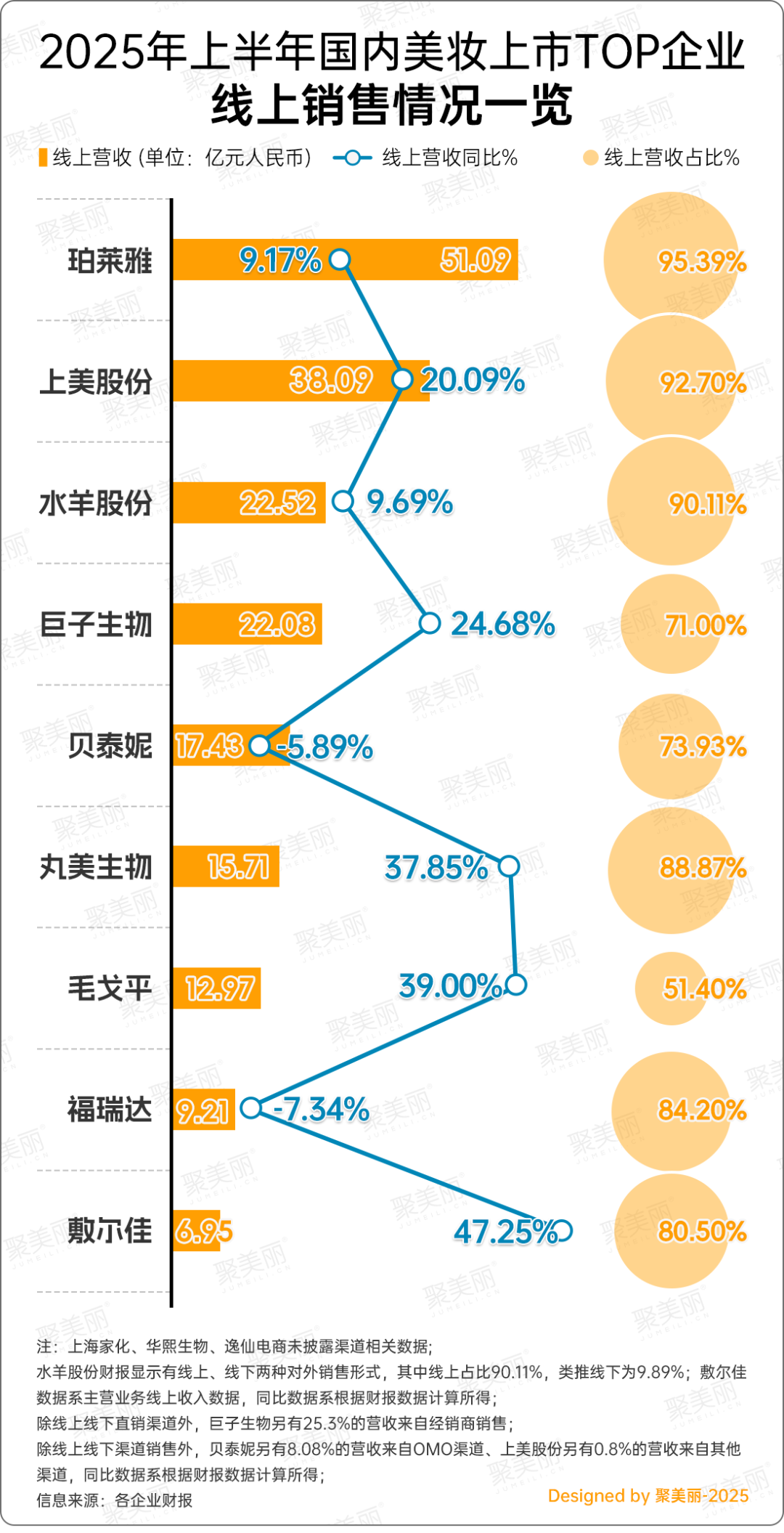這一結(jié)構(gòu)特征意味著,線上已不僅是“重要渠道”,更成為絕大多數(shù)國(guó)貨美妝企業(yè)營(yíng)收的絕對(duì)主力。