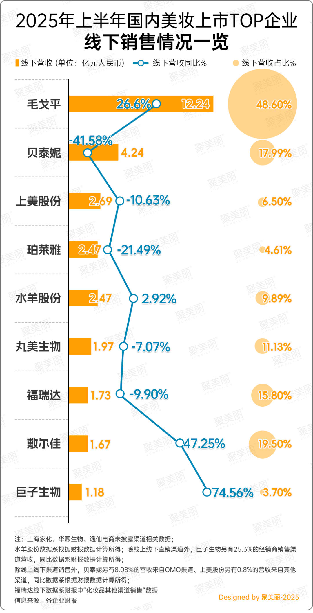 與線上渠道普遍增長(zhǎng)形成鮮明對(duì)比的是,多數(shù)國(guó)貨美妝企業(yè)的線下?tīng)I(yíng)收同比出現(xiàn)下滑,線下占比也呈現(xiàn)整體收縮趨勢(shì)。