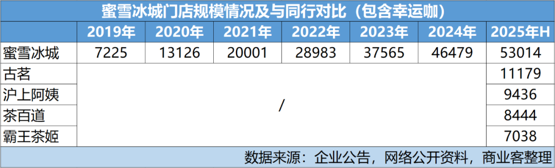 而蜜雪冰城在2024年末至今短短半年,凈新增了6535家門(mén)店,總門(mén)店數(shù)量達(dá)到53014,就算撇除幸運(yùn)咖,門(mén)店規(guī)模仍遠(yuǎn)遠(yuǎn)拋開(kāi)同行。加盟商數(shù)量也從19310名,快速增長(zhǎng)至23404名。