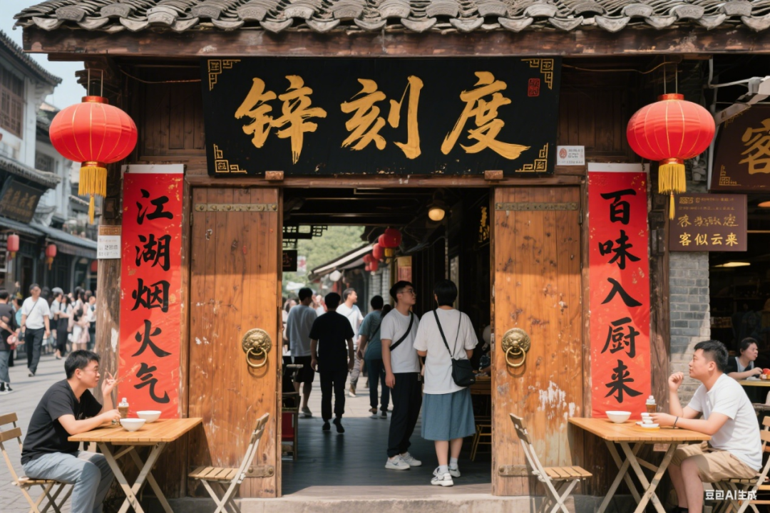 這些AI門頭圖的來頭并不復(fù)雜。畢竟,在AI工具盛行的當(dāng)下,許多AI生成軟件都可提供類似的圖片生成服務(wù),比如“即夢”或者“豆包”,鋅刻度在“豆包”輸入“請生成一張以鋅刻度為門頭的江湖菜館照片,體現(xiàn)出客人很多,門店很大氣!眲t得到以下圖片: