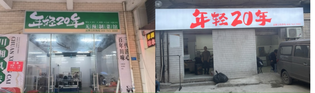 還有不少外賣連鎖店,使用同一套AI門頭圖,但實體門店則是各有各的簡陋。比如一家名為“年輕20年”的川湘菜館,在全國多地都有外賣店,但以重慶為例,鋅刻度在地圖上搜索其店鋪位置,發(fā)現(xiàn)真實的門頭照與其所謂的“明廚亮灶”差別較大。
