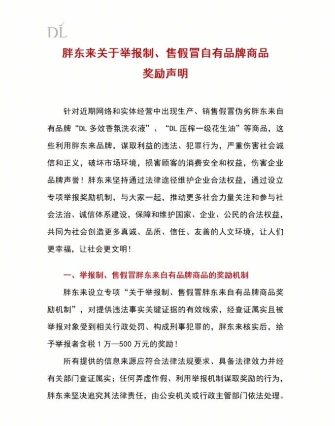 聲明稱,針對近期網(wǎng)絡(luò)和實體經(jīng)營中出現(xiàn)生產(chǎn)、銷售假冒偽劣胖東來自有品牌“DL多效香氛洗衣液”“DL壓榨一級花生油”等商品,這些利用胖東來品牌,謀取利益的違法、犯罪行為,嚴(yán)重傷害社會誠信和正義,破壞市場環(huán)境,損害顧客的消費安全和權(quán)益,傷害企業(yè)品牌聲譽(yù)。