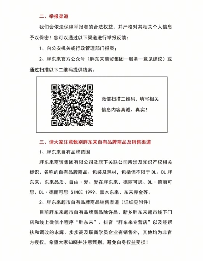 為幫助消費者有效甄別,胖東來還明確了其自有品牌的范圍及官方銷售渠道。其自有品牌包括“DL”、“DL胖東來”、“東來品質(zhì)”、“自由·愛”等多個系列。