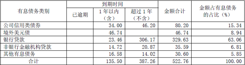 截至6月末,新城控股合并口徑有息債務(wù)余額為522.76億元,較期初的536.50億元下降2.56%。其中,一年內(nèi)到期債務(wù)為135.5億元(含46.74億元美元債),一年以上債務(wù)為387.26億元。此外應(yīng)付賬款規(guī)模389.77億元。