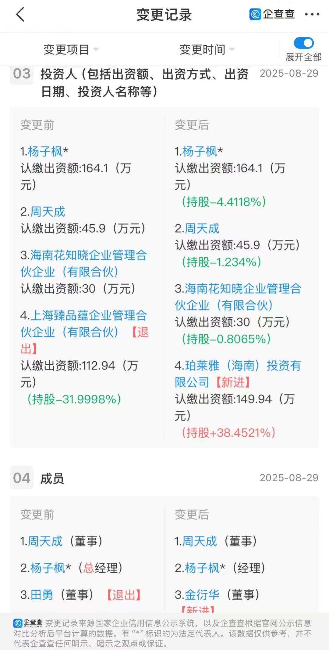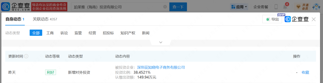 日前(8月31日),據(jù)企查查信息顯示,珀萊雅(海南)投資有限公司(下稱(chēng):珀萊雅海南)新增一例對(duì)外投資,投資對(duì)象系深圳花知曉電子商務(wù)有限公司,從投資比例看,其以38.45%的持股比例成為花知曉第二大股東,第一大股東為花知曉聯(lián)合創(chuàng)始人兼CEO楊子楓,占股42.08%。