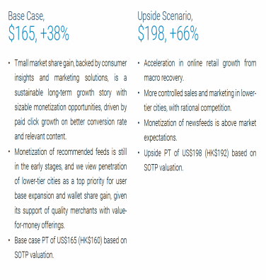 華爾街投行杰弗瑞則更為樂觀,根據(jù)其預測,阿里巴巴股價的上限區(qū)間有望達到198美元(約合1414元人民幣),相比目前的股價,潛在漲幅達66%。
