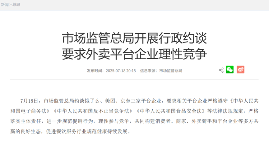 由于外賣平臺(tái)的競(jìng)爭(zhēng)異常激烈,嚴(yán)重?cái)_亂了正常的商業(yè)秩序,有關(guān)部門已開始加強(qiáng)監(jiān)管。2025年7月18日,市場(chǎng)監(jiān)管總局約談餓了么、美團(tuán)、京東,要求各平臺(tái)規(guī)范促銷行為,理性參與競(jìng)爭(zhēng),共同構(gòu)建消費(fèi)者、商家、外賣騎手和平臺(tái)企業(yè)等多方共贏的良好生態(tài),促進(jìn)餐飲服務(wù)行業(yè)規(guī)范健康持續(xù)發(fā)展。