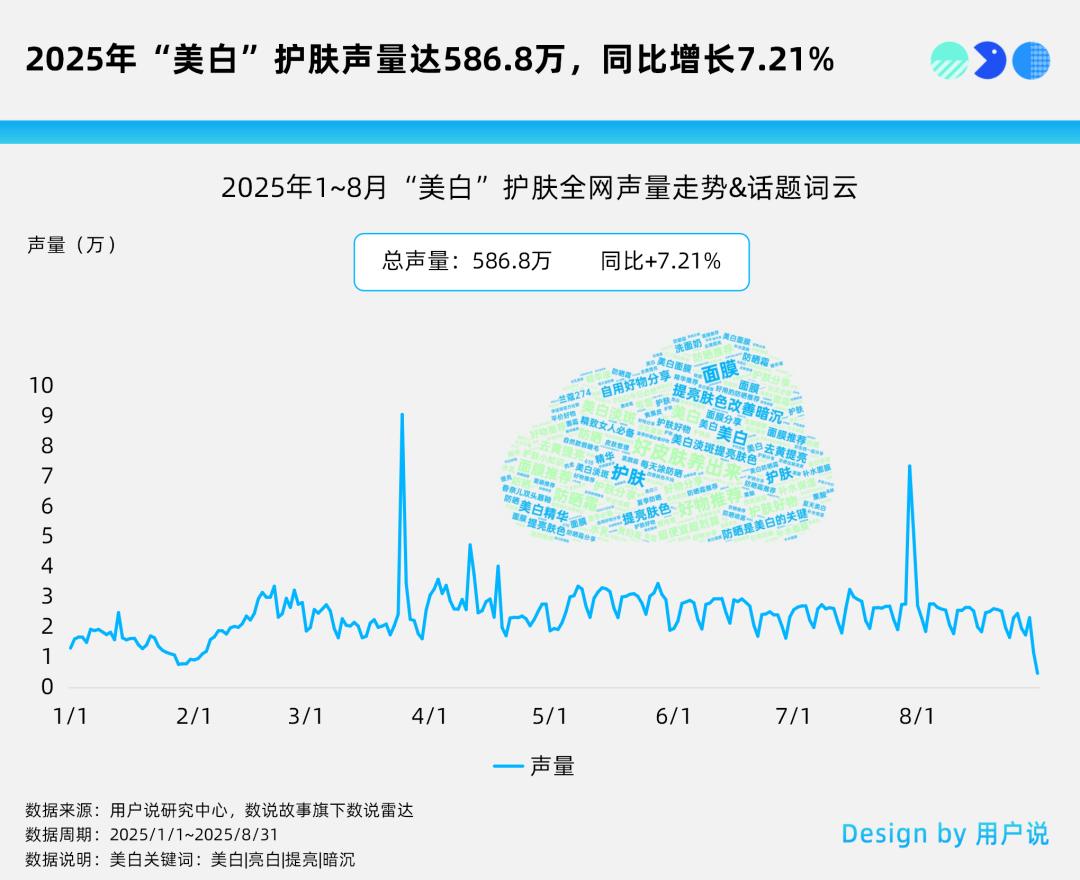 一年過去,美白市場熱度不減。用戶說數(shù)據(jù)顯示,2025年開年至今,全網(wǎng)“美白”相關(guān)聲量586.8萬,同比增長7.21%,其中對“提亮膚色”“美白淡斑”“去黃”等討論度熱情高漲。