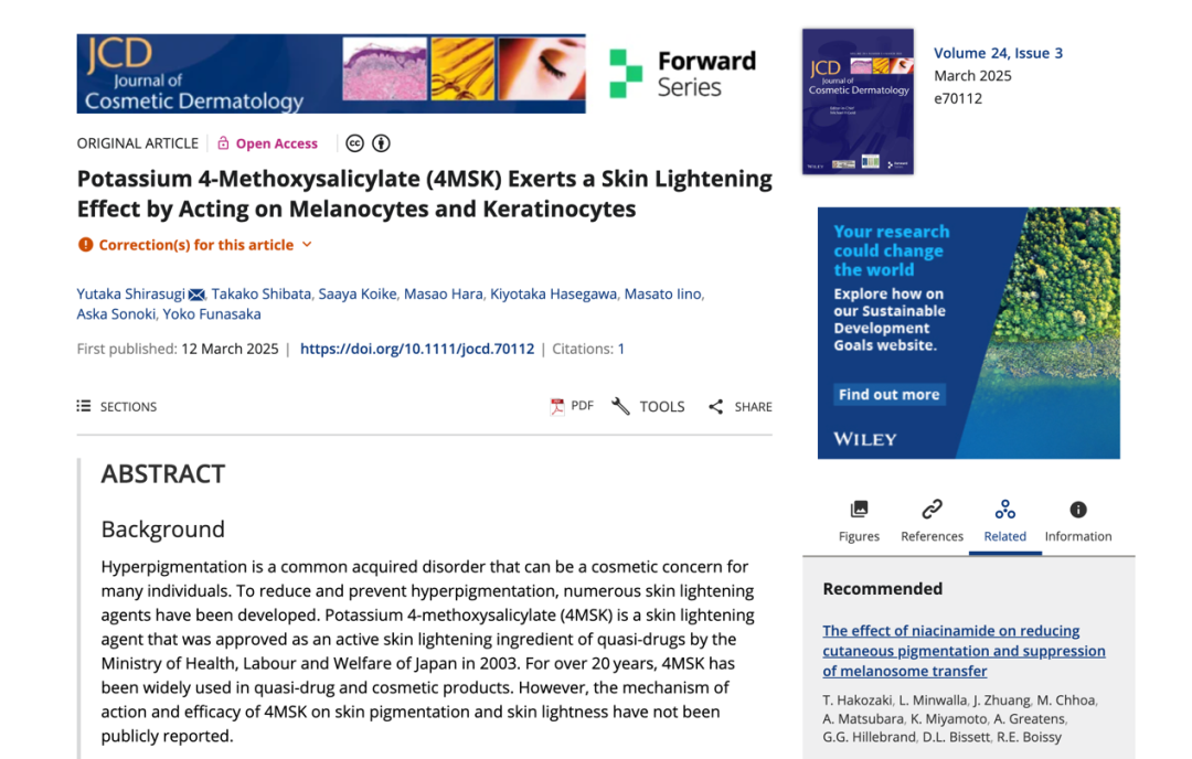作為資生堂的王牌美白成分,自2003年獲得日本厚生勞動省批準(zhǔn)以來,已在護(hù)膚品中應(yīng)用超過20年。然而,其詳盡的科學(xué)機(jī)制和臨床數(shù)據(jù)直到近期才由資生堂團(tuán)隊(duì)在《Journal of Cosmetic Dermatology》上首次公開發(fā)表,該文章不僅系統(tǒng)性地驗(yàn)證了4MSK的功效,更重要的是,它清晰地描繪了一個(gè)“抑制生成”與“加速代謝”雙通路協(xié)同的美白范式。