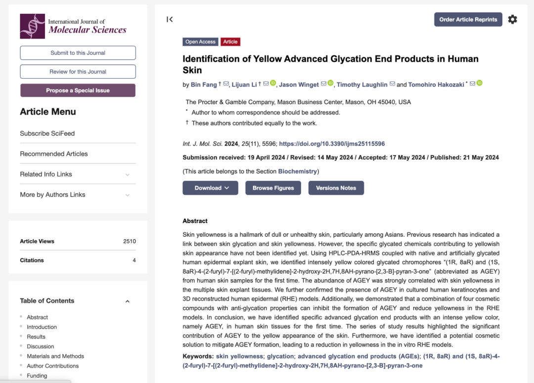 OLAY科研人員進(jìn)一步發(fā)現(xiàn),AGEs中的關(guān)鍵物質(zhì)AGEY具有強(qiáng)大的“染色”破壞力,是“染黃”肌膚蛋白的關(guān)鍵染料。2024年,OLAY在《國際分子科學(xué)》上發(fā)表文章,向科學(xué)界論證了這一突破性發(fā)現(xiàn)。