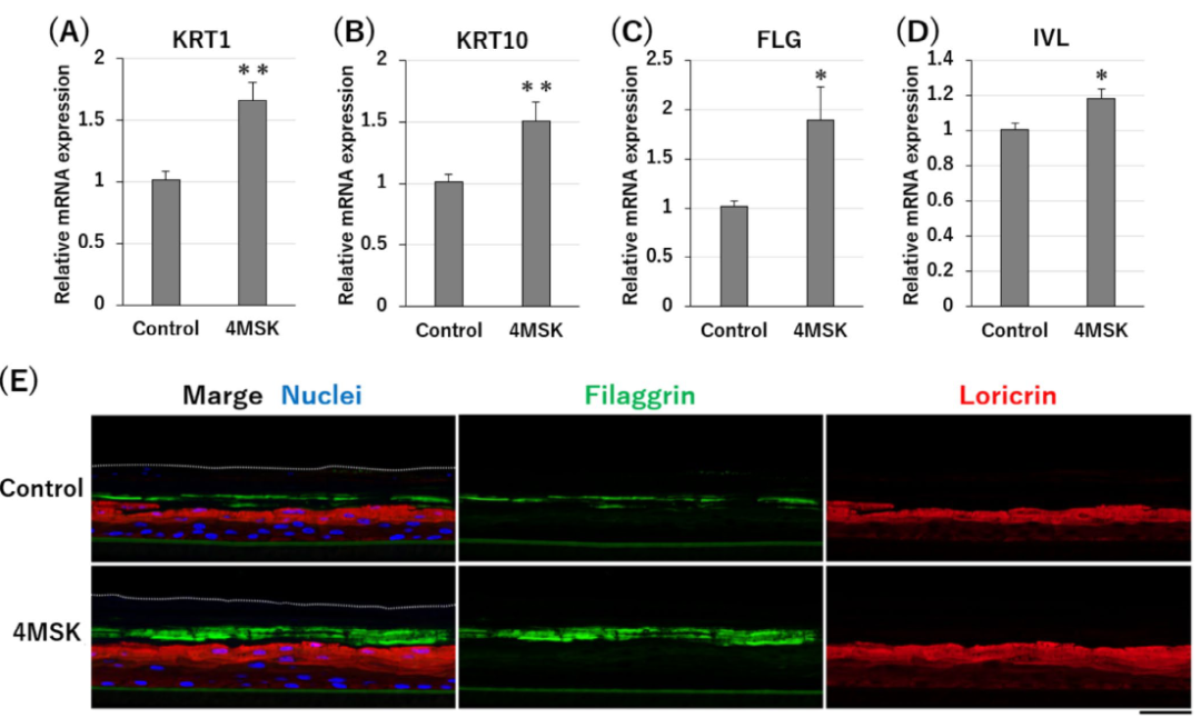 通路二,促進(jìn)角質(zhì)細(xì)胞分化,加速黑色素“代謝”。這是在其研究中最具啟發(fā)性的發(fā)現(xiàn)之一:4MSK能夠顯著上調(diào)角質(zhì)形成細(xì)胞中的多種分化標(biāo)志物,包括早期分化標(biāo)志物(如角蛋白KRT1/KRT10)和終末分化標(biāo)志物(如絲聚蛋白FLG/兜甲蛋白IVL)。