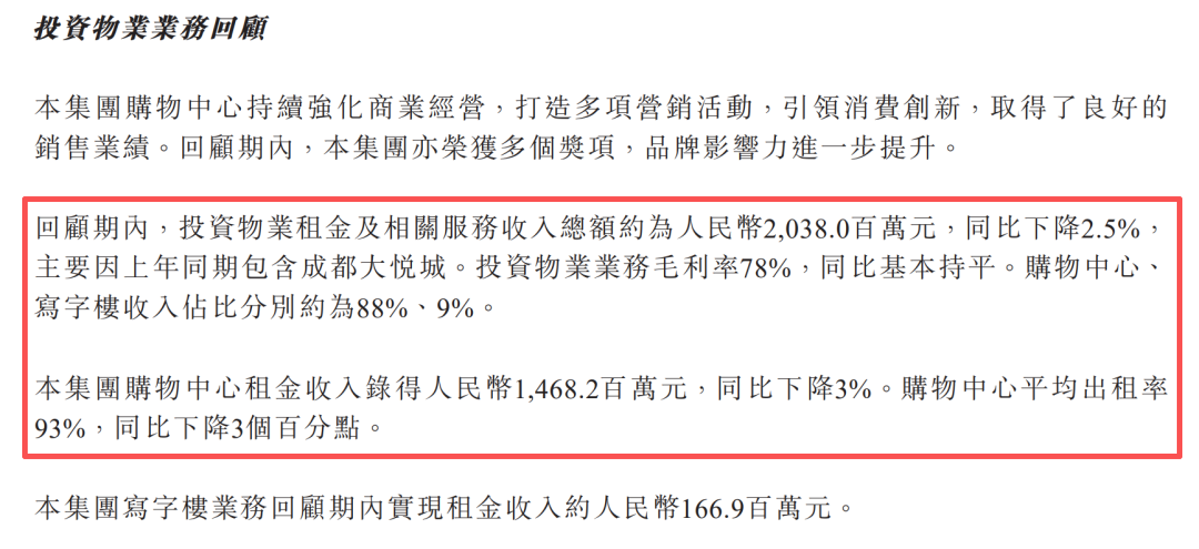 購(gòu)物中心租金收入錄得人民幣14.68億元,同比下降3%;購(gòu)物中心平均出租率93%,同比下降3%。