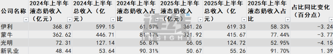 從液態(tài)奶收入占比較高的幾家企業(yè)來看,2025年上半年,伊利、蒙牛、光明、新乳業(yè)的液態(tài)奶收入分別為361.26億元、321.92億元、66.05億元和50.67億元,占總收入比例分別為58.33%、77.4%、53%和91.70%。