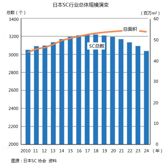 2024年日本SC總數(shù)量為3037個(gè),比2023年減少55個(gè),與2018年的3220個(gè)比較,6年來(lái)持續(xù)減少。行業(yè)總經(jīng)營(yíng)面積為5391m²,同比減少50萬(wàn)m²?傮w平均店鋪面積為17751m²,比2023年的17598m²,略有增加,新開(kāi)店的規(guī)模在縮小。
