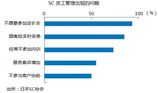 從2015年開(kāi)始日本SC 協(xié)會(huì)實(shí)施《人才確保定量調(diào)查》。本期調(diào)查有84%的開(kāi)發(fā)商企業(yè)認(rèn)為商戶(hù)用工不足,人員短缺問(wèn)題非常突出。主要因素是崗位價(jià)值吸引力下降,就業(yè)待遇低,缺乏授權(quán),協(xié)調(diào)難度大,客戶(hù)騷擾頻繁,是現(xiàn)場(chǎng)的難題,青年不愿意在零售崗位工作,穩(wěn)定性很差、頻繁跳槽。具體表現(xiàn)是店長(zhǎng)或副店長(zhǎng)脫崗、銷(xiāo)售高峰期丟單、不能保障參加統(tǒng)一組織的研修活動(dòng)、新員工崗位存活率低,不穩(wěn)定。