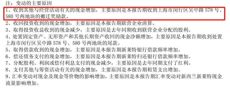 不過,今年上半年光明乳業(yè)經(jīng)營活動產(chǎn)生的現(xiàn)金流量凈額4.17億元,同比大增82.28%;然而,現(xiàn)金流增長核心原因是“收到上海市閔行區(qū)吳中路578號、580號兩地塊的搬遷獎勵款”。這是典型的非經(jīng)常性收益,和乳制品生產(chǎn)銷售的主營業(yè)務(wù)毫無關(guān)系。