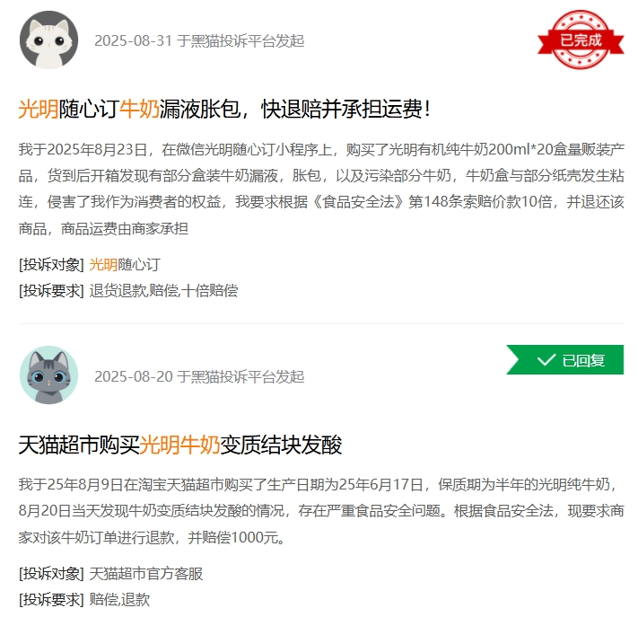 口味是消費(fèi)者選擇奶制品的關(guān)鍵,除此之外,食品安全問題也會影響消費(fèi)者對品牌的忠誠度!叭そ馍虡I(yè)”注意到,“黑貓投訴”平臺上有近千條投訴包含搜索詞“光明牛奶”,不少消費(fèi)者投訴內(nèi)容是有關(guān)“牛奶變質(zhì)”“異味”等食品安全問題。