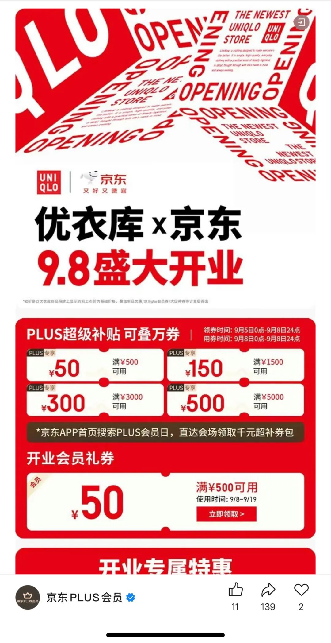 事實上,9月5日,優(yōu)衣庫官方旗艦店就已入駐,消費者可以在官方旗艦店領取品牌特別推出的開業(yè)會員禮券,只是要等到9月8日才能購買。