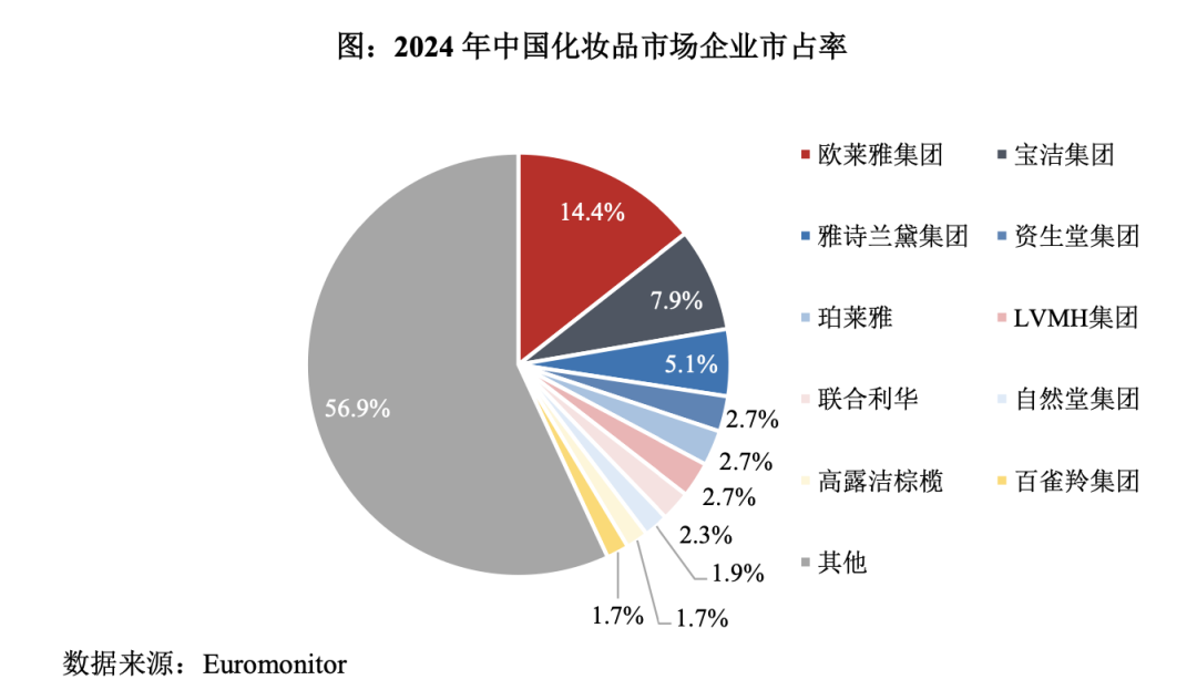 第一類為以歐萊雅集團、寶潔集團及雅詩蘭黛集團為代表的國際大型日化集團,其憑借在品牌矩陣、渠道控制力與產(chǎn)研發(fā)方面的顯著競爭優(yōu)勢,市場份額居前;