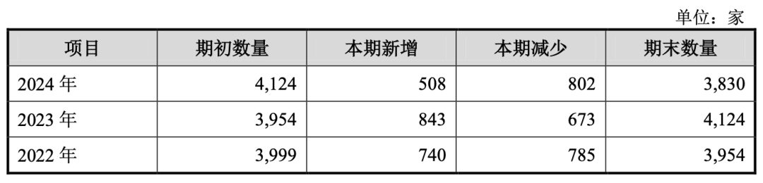 不過,截至2024年,加盟門店數(shù)量出現(xiàn)凈減少。雖然年內(nèi)新開508家,但閉店了802家,凈減294家。