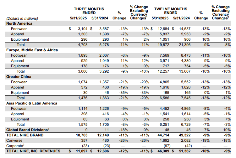 其中,大中華區(qū)營收在上一財年短暫恢復增長后,再度陷入下滑。數(shù)據(jù)顯示,此前2022-2023財年,耐克大中華區(qū)營收已遭遇兩連降,2024年略有起色后,2025再度下降13%至65.86億美元(約合人民幣470.44億元)。不過,第四季度大中華區(qū)實現(xiàn)營收14.76億美元(約合人民幣105.43億元),超過了分析師預期。