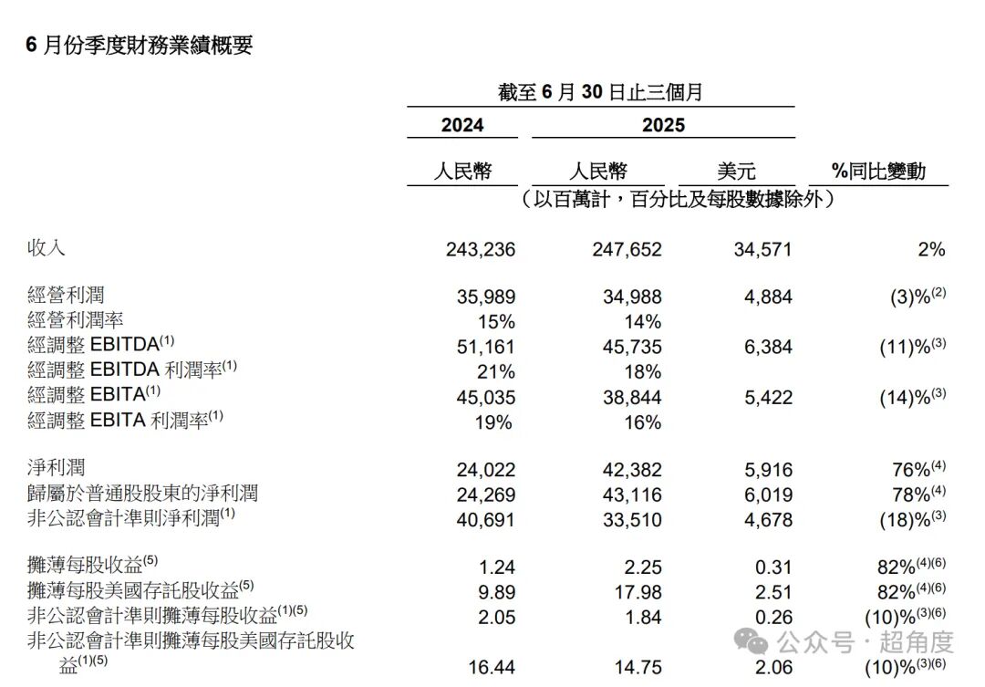 最后來看阿里,其雖未全面參戰(zhàn),但也難以獨善其身。在今年二季度,阿里營收2476.52億元,同比微增2%,凈利潤同比增長76%。不過若是剔除股權(quán)投資等因素,在更反映主營業(yè)務(wù)經(jīng)營情況的非公認(rèn)會計準(zhǔn)則下,其凈利潤為335億元,同比下降18%。