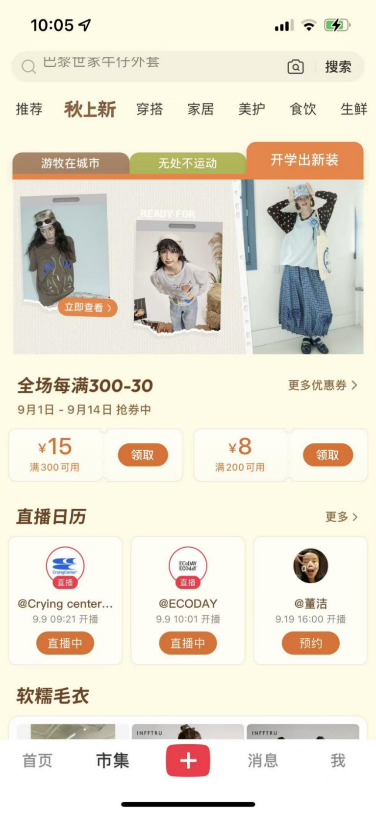 “市集”保留了小紅書首頁標(biāo)志性的雙列流設(shè)計,以筆記、直播等形式呈現(xiàn)商品,上方有市集直播、買手櫥窗、新品首發(fā)等頻道,形成一個區(qū)別于傳統(tǒng)貨架電商的獨特生態(tài)。