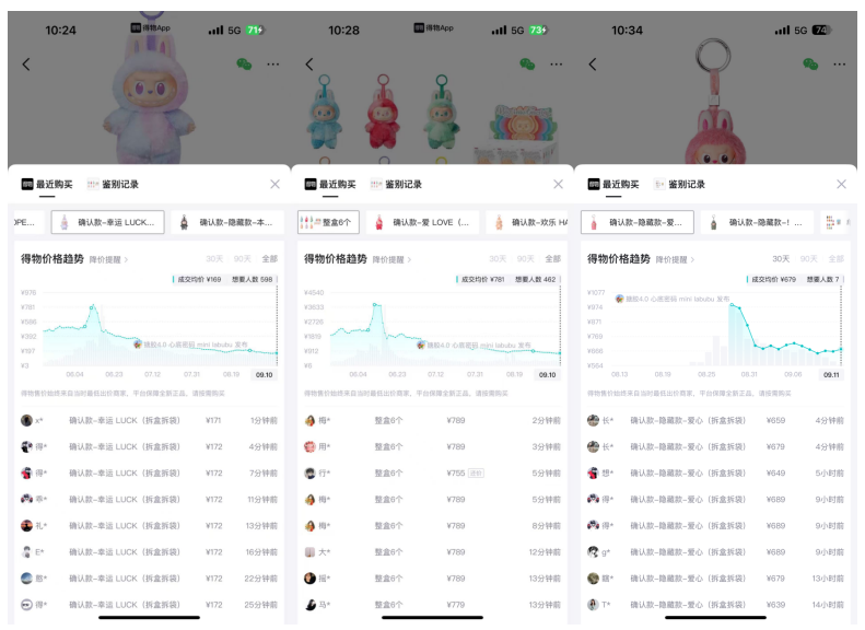 單看剛發(fā)布不久的“搪膠4.0 mini LABUBU”,在得物APP銷(xiāo)量最高的“L”款,成交均價(jià)也基本下降了30%。