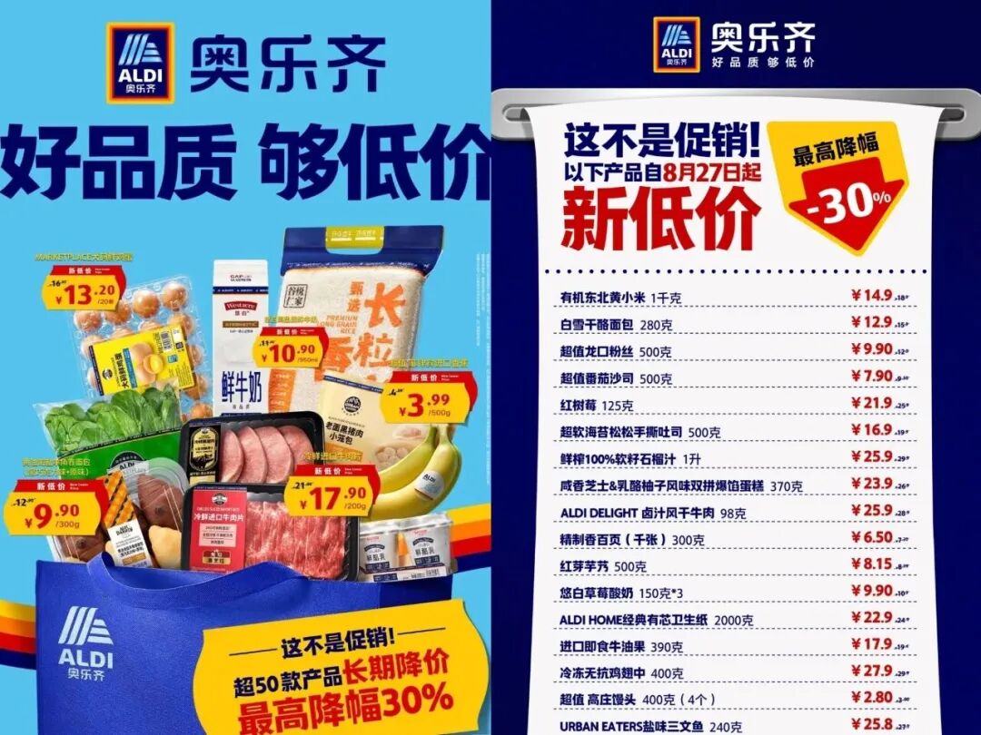 物美在北京一口氣開出六家名為“物美超值”的折扣店,由傳統(tǒng)大賣場改造而來,以“精選商品+極致性價比”為核心,全部商品圍繞三餐與高頻剛需做減法,主打“1300個SKU+60%自有品牌”。中百集團首家折扣店也在近日開業(yè),其門店經(jīng)營面積超600平方米,SKU(庫存量單位)超2000種,涵蓋生鮮、食品等。還有德國折扣巨頭奧樂齊也加速在華擴張,同步在無錫、蘇州開出新店,并宣布下調(diào)50多款日需品價格,最高降幅達(dá)30%。